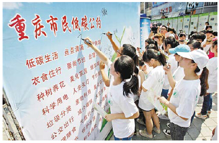 重慶市民在“低碳公約”上簽名,表達(dá)自己踐行低碳生活的意愿